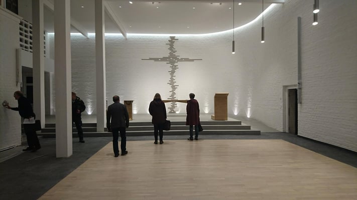 Besonderheit: Hier wurde durch uns der Alt-Parkettboden in der Kirche fachgerecht ausgebaut, in der Trockenkammer akklimatisiert und auf eine Holzfeuchte von ca. 7- 8 % schonend getrocknet. In der Werkstatt wurde der Parkettboden Instandgesetzt, um das Parkett später auf einen durch uns eingebrachten Schnellestrich mit Fußbodenheizung verklebt wieder einzubauen.